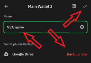 2.8. Now, rename the wallet to “VVA your name” (example: “VVA Slavic). Also, it would be a good time to back up your wallet now. And click on the check mark to save your changes.