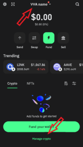 2.10. Make sure the name of the wallet on the top center has “VVA and your name” and click on ” manage crypto”.