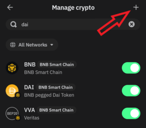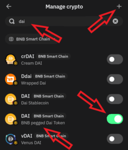 2.14. In the top left corner, type into the search “dai”, toggle the switch on the right side of “BNB pegged Dai Token”. And after adding “DAI” to your wallet, click on the plus sign in the top right corner.