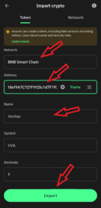 2.15. First, switch the network from “Bitcoin” to the “BNB Smart Chain”. Next, copy the token address “0x41B7127Cf84818ef9A7C727F9f25c1d7F192e293 ” and paste it into the address box. Next, you’re going to verify the following three boxes. In the box name, you should have “Veritas”, in the symbol – “VVA”, in decimals – “9”. After verifying, click on “Import”