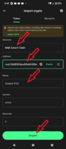 2.18. Now repeat the same process, adding this new token address ” 0xf3fb455Af19fa0Fa314c6128dD5Fdee5A44FcE8e “. First, change the network to “BNB Smart Chain, Next, paste the new token address, verify the right information has been imported into the name – “Staked VVA”, symbol – “sVVA”, and decimal – “9”, and then tap “Import.”
