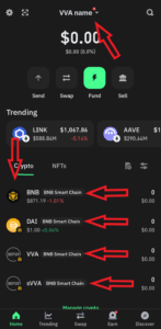 2.20. Your wallet should look something like this. At the top center, you should have “VVA ” and your name, and at the bottom half, you should have the four following tokens, “BNB”, “DAI”, “VVA”, and “sVVA”, all four on a “BNB Smart Chain” network.