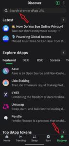 4.2. Open your trust wallet and tap on “Discover” in the bottom right corner. Paste the invite link into the search bar at the top, and tap on the search icon on your on-screen keyboard.
