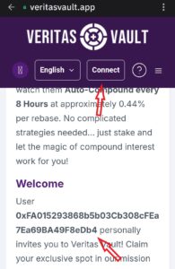 4.4. Now you’re at the Veritas Vault website. First, you will need to scroll down to a section labeled “Welcome” that shows your sponsor’s wallet address. You will need to verify with your sponsor the last three digits of that wallet address to confirm you have the correct link and are registering under your sponsor, not someone else. After confirmation, you can tap on “Connect” at the top center.
