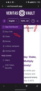4.6. After completing a connection, you should see the last two digits of your wallet address in the top center section inside the box. Now click on the menu button, the three lines on the top right side, and select “Buy VVA”.