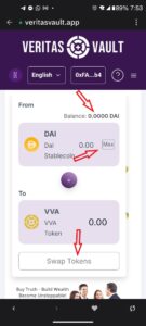 4.7. Scroll down to the bottom of the page until you see the section in the picture, verify that the balance equals your wallet DAI balance, tap on “Max”, confirm the output VVA amount, and tap on “Swap Tokens”. On the two pop-up screens, approve the transaction, analyzing the fee that you will pay. (On the first screen, it should be $0.00, and on the second one, no more than $0.50. Wait for the notification at the top of the screen to indicate that the swap is completed.