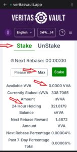 4.9. Scroll down to the Stake and UnStake section, as shown in the picture. Verify the available VVA, tap on Max, and then tap on the green Stake button. You will be asked to confirm the transaction twice on Trust Wallet. Fees are estimated to be the same as in the previous transaction. After completing the stake, a new balance should be added to your 24-hour holding. After completing the state process, you will need to wait a minimum of 24 hours before doing the next step.