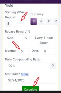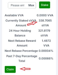 4.10. After a minimum of 24 hours have passed from the staking time, come back to the same screen, scroll a little bit further, and click on the green claim button. This will activate your staking amount, and the amount will be transferred to the Current Staked sVVA. You will start receiving an estimated 1% a day on your balance.